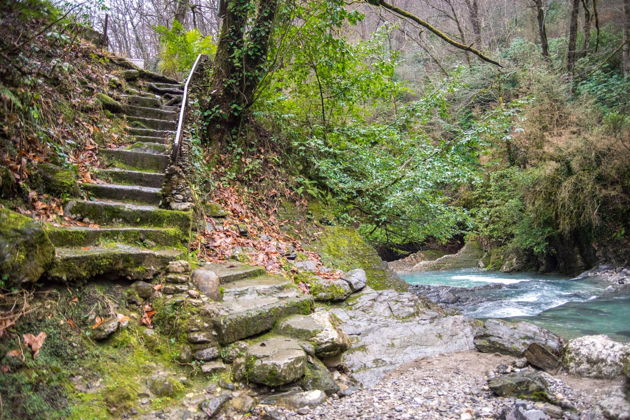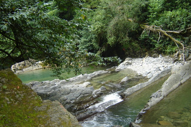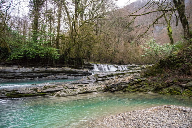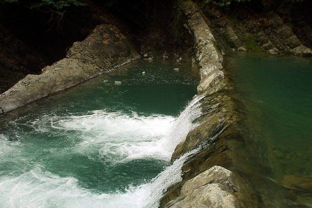 В верховьях реки Западный Дагомыс, в тенистом самшитовом урочище расположились дагомысские «корыта». Они представляют собой крутопадающие пласты осадочных горных пород протянулись поперек русла реки. Обладая различной прочностью и устойчивостью к размыву, пласты песчаников, аргиллитов, известняков и мергелей размыты рекой в разной степени, что привело к образованию многочисленных уступов, гребней, впадин и ванночек, напоминающих корыта. Отсюда и название "Корыта". Вода падает с уступов, пенится, переливается из одного водоема в другой, поражая воображение игрой своих сине-зеленых струй. А вокруг белые скалы, заросли вечнозеленого самшита, кроны могучих дубов, буков и каштанов. Еще Корыта называют Озерами Любви. Скорее всего, такое имя это место получило совсем недавно – по крайней мере, среди многообразия прекрасных горских легенд ни в одной нет точного указания на это место. Хотя живописность этого уголка, скорее всего, навевала романтическое настроение издревле. Как бы то ни было, Корыта стали не только популярным местом отдыха, экскурсионным объектом, но и традиционным местом паломничества молодоженов в день свадьбы. Уютное кафе на берегу реки с блюдами кавказской кухни, возможность искупаться в прохладное воде, красивые горные пейзажи делают это место идеальным для загородного отдыха.